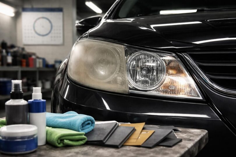 En matière de produits, les kits de rénovation de phares incluent souvent du papier abrasif, un produit de polissage et un scellant, tandis que d’autres solutions maison peuvent inclure :